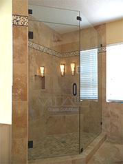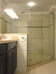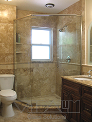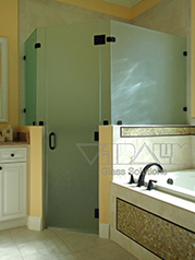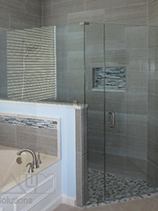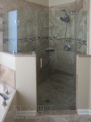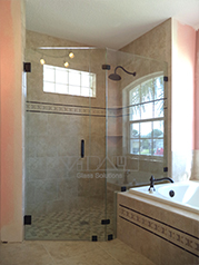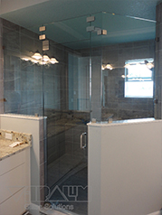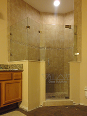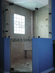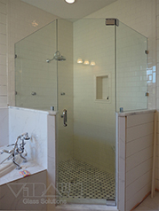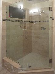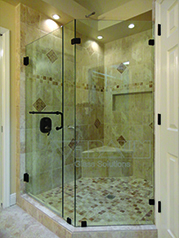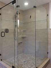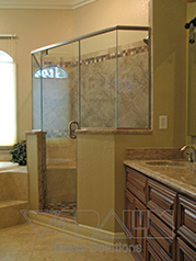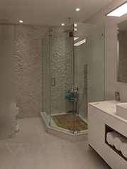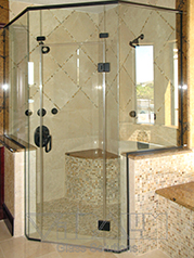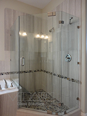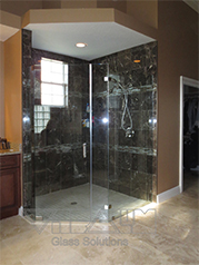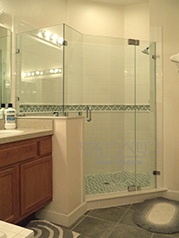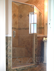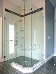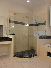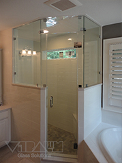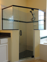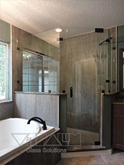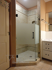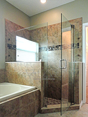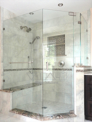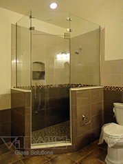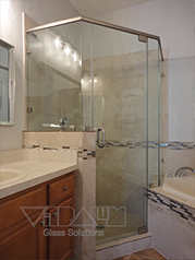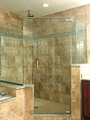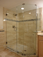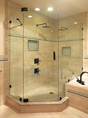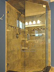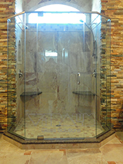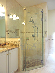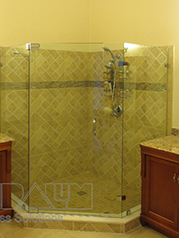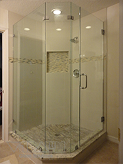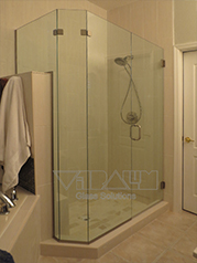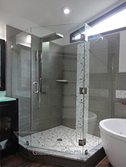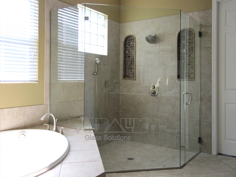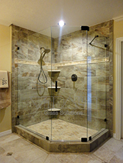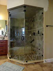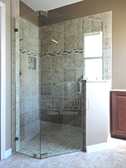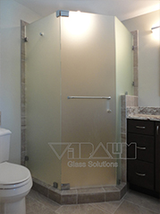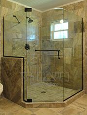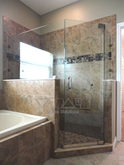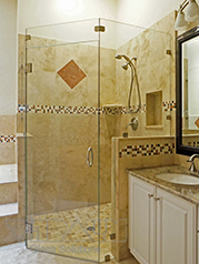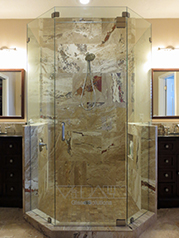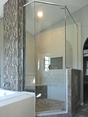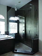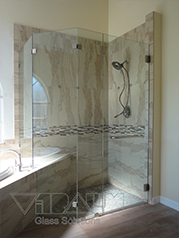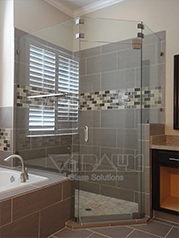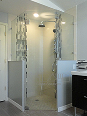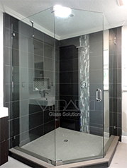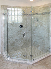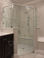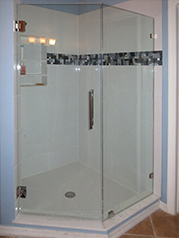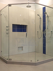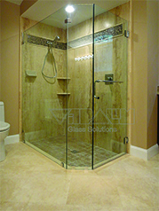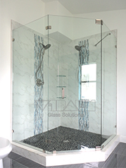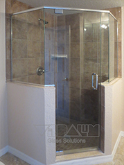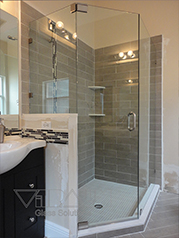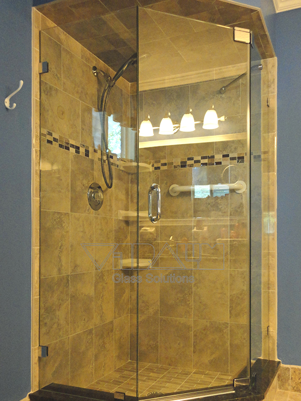 The neo angle design adds pizazz with a designer look and a touch of creative problem-solving for corner showers. A neo angle, or diamond-shaped, shower has three glass sides enclosing two walls. And is most often used as a stylish, space-saving corner shower. Instead of squaring off two glass panels to build out a corner shower, the neo angle design typically includes a glass door placed across from the inner corner of the shower. Then two glass panels on either side of the door return to each wall at 135 degree angle.