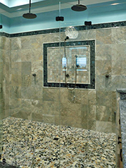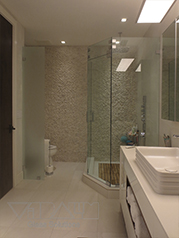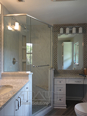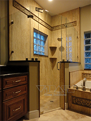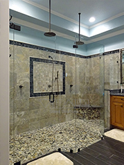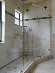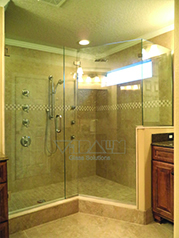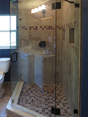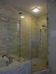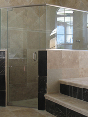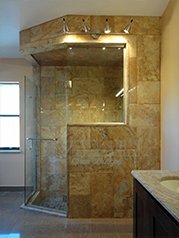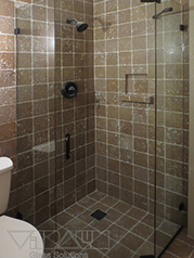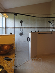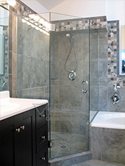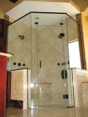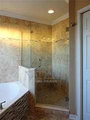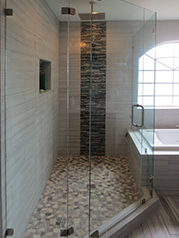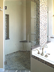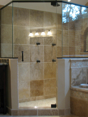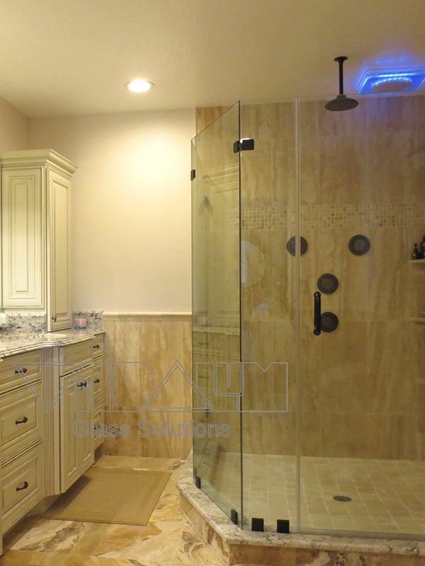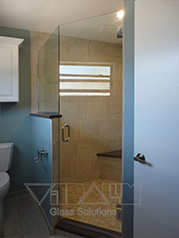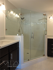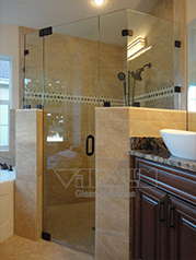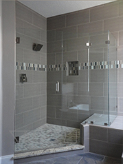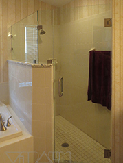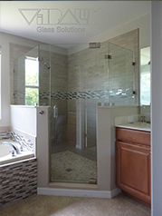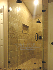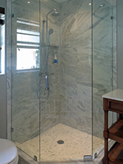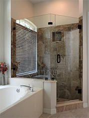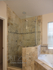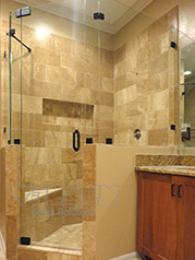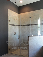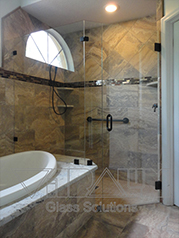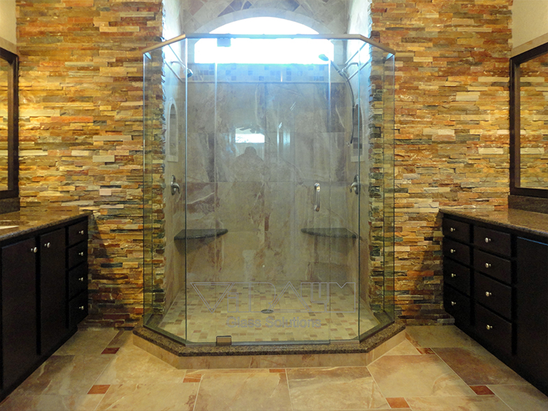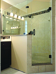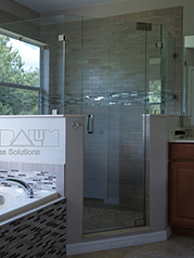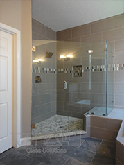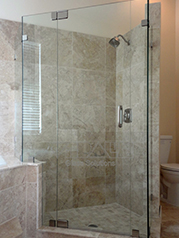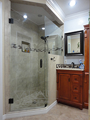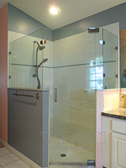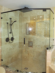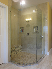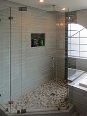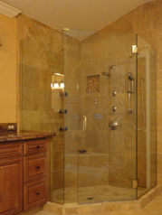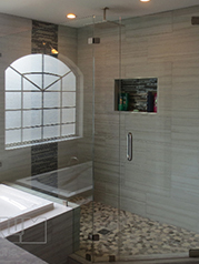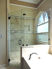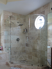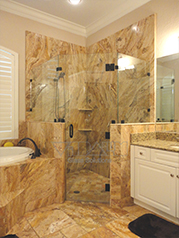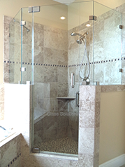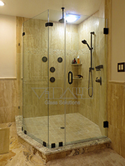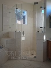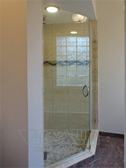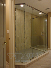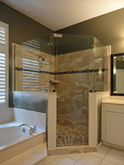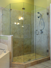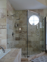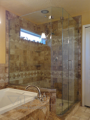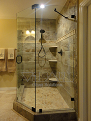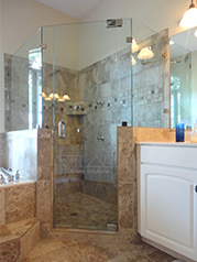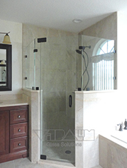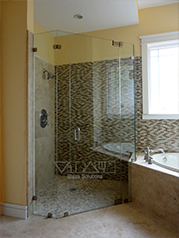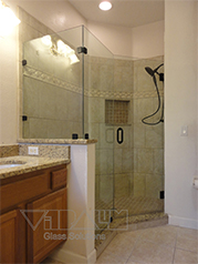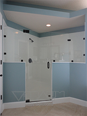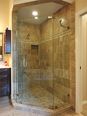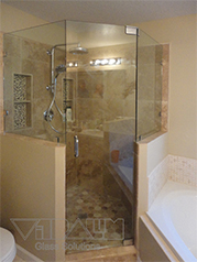 The neo angle design adds pizazz with a designer look and a touch of creative problem-solving for corner showers. A neo angle, or diamond-shaped, shower has three glass sides enclosing two walls. And is most often used as a stylish, space-saving corner shower. Instead of squaring off two glass panels to build out a corner shower, the neo angle design typically includes a glass door placed across from the inner corner of the shower. Then two glass panels on either side of the door return to each wall at 135 degree angle.