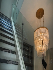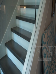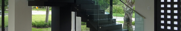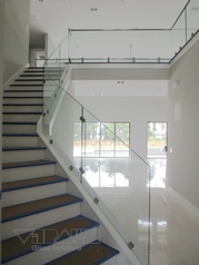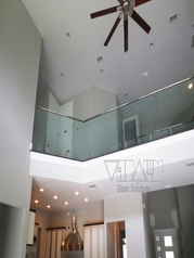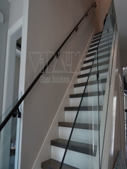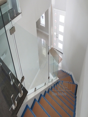 The standoff glass railing system can be used in both the exterior and interior. Most commonly this system is excellent for interior applications such as glass railings and glass staircases where the entire perimeter of the glass is exposed for a more modern look. Standoffs are installed in solid surfaces such as steel, wood or concrete, in the face of a staircase or balcony. The glass is suspended vertically by standoffs and each piece is independent of other pieces for support, unless a handrail is installed for additional strength.